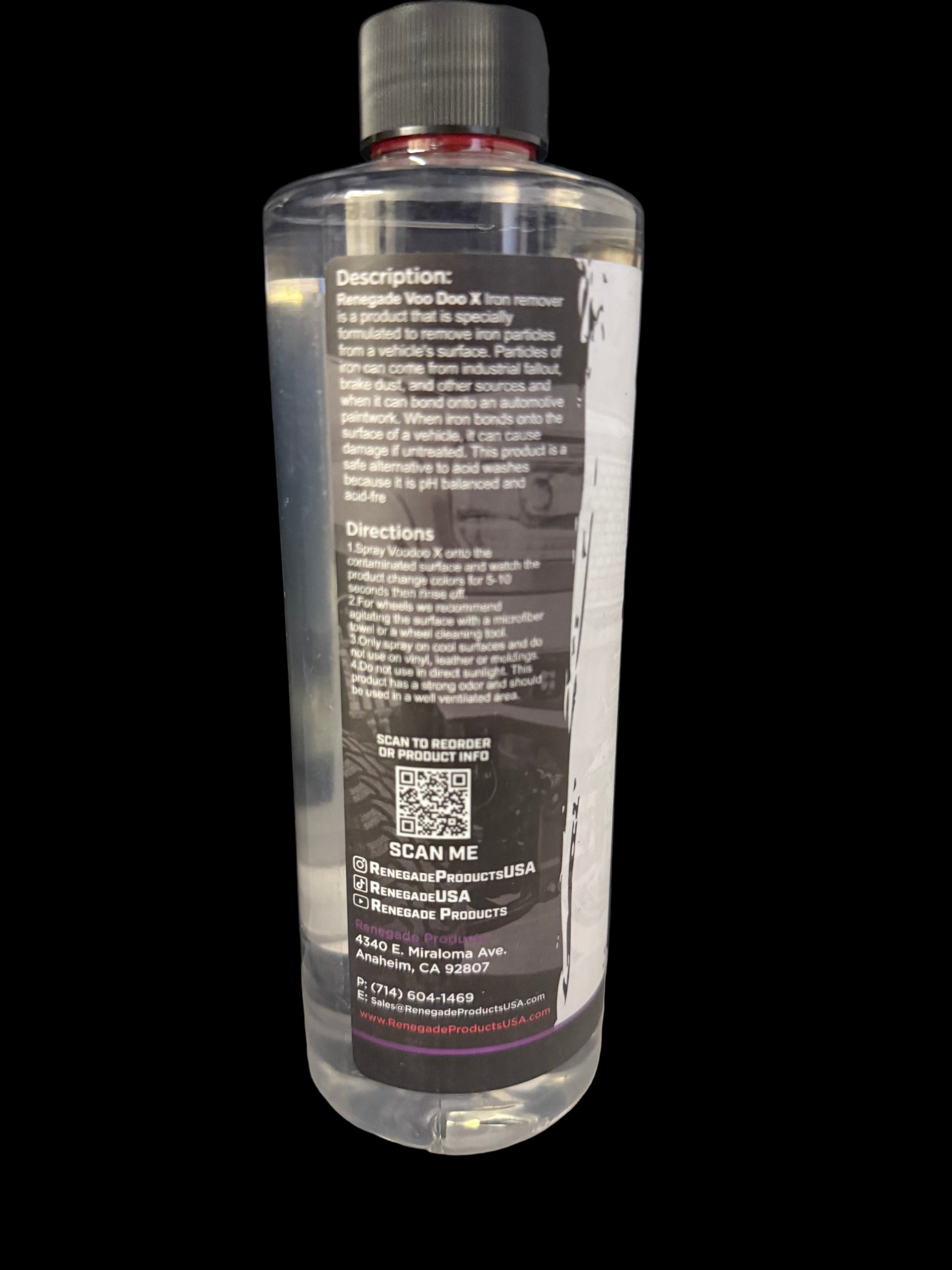 Voodoo X is masterful at removing iron particles and industrial fallout from your vehicle's paint and wheels. As this product dissolves iron particles, it will change to a dark purple color. This formula is acid free & PH balanced.